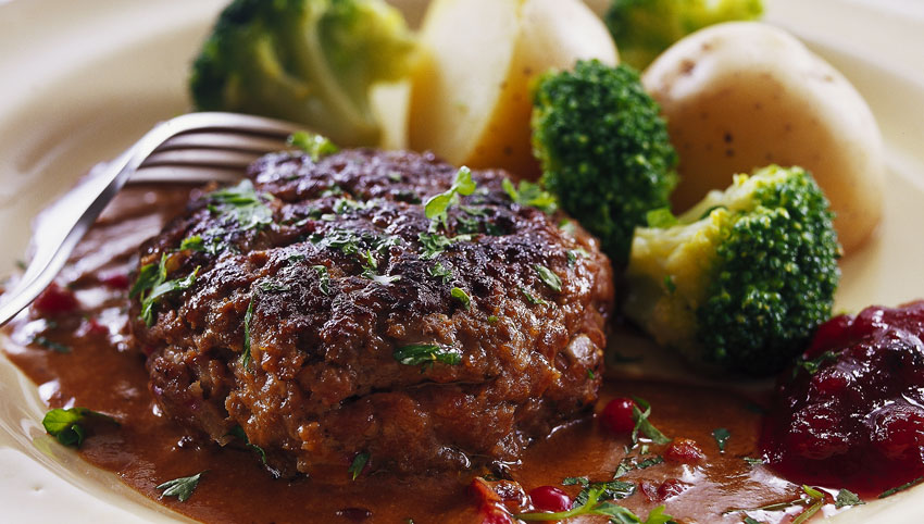Enbär och lingon ger dessa nötfärsbiffar smak av vilt. Servera med nykokt potatis och broccoli samt den goda såsen gjord med bl.a. kalvfond och lingon.